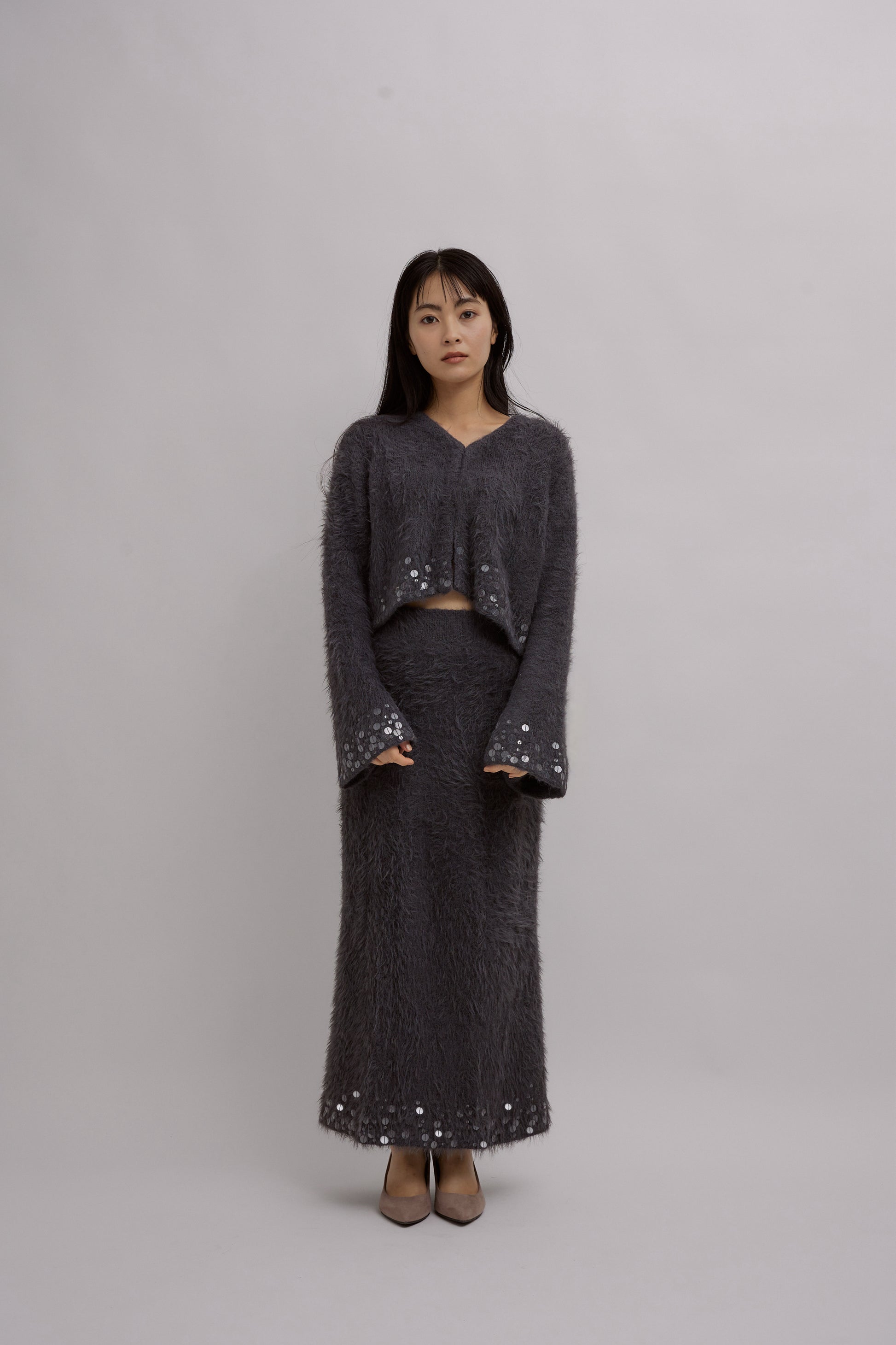前回のVALLANで大好評だった”Spangles Knit Setup”やsachatでのMohair Knit Setupを融合。モヘアのような柔らかな質感に、雪の結晶のような透明のスパンコールを散りばめ、上品な煌めきがまるでせせらぎのように穏やかな心地よさをもたらします。着るたびに癖になる、程よい華やかさが楽しめます。 カーディガンは、トップスとしてもスタイリング可能な2WAY仕様。ショート丈のデザインは、スタイルアップ効果も期待でき、バランスよく着こなせます。 スカートは様々なスタイリングが可能で、冬のコーディネートにおしとやかでありながら華やかさを引き出すアイテム。 ウエストはゴム仕様でしっかりとフィットし、どの身長の方も、ご自身の好みのウエスト位置に調整できるため、着丈を心配することなくお召しいただけます。