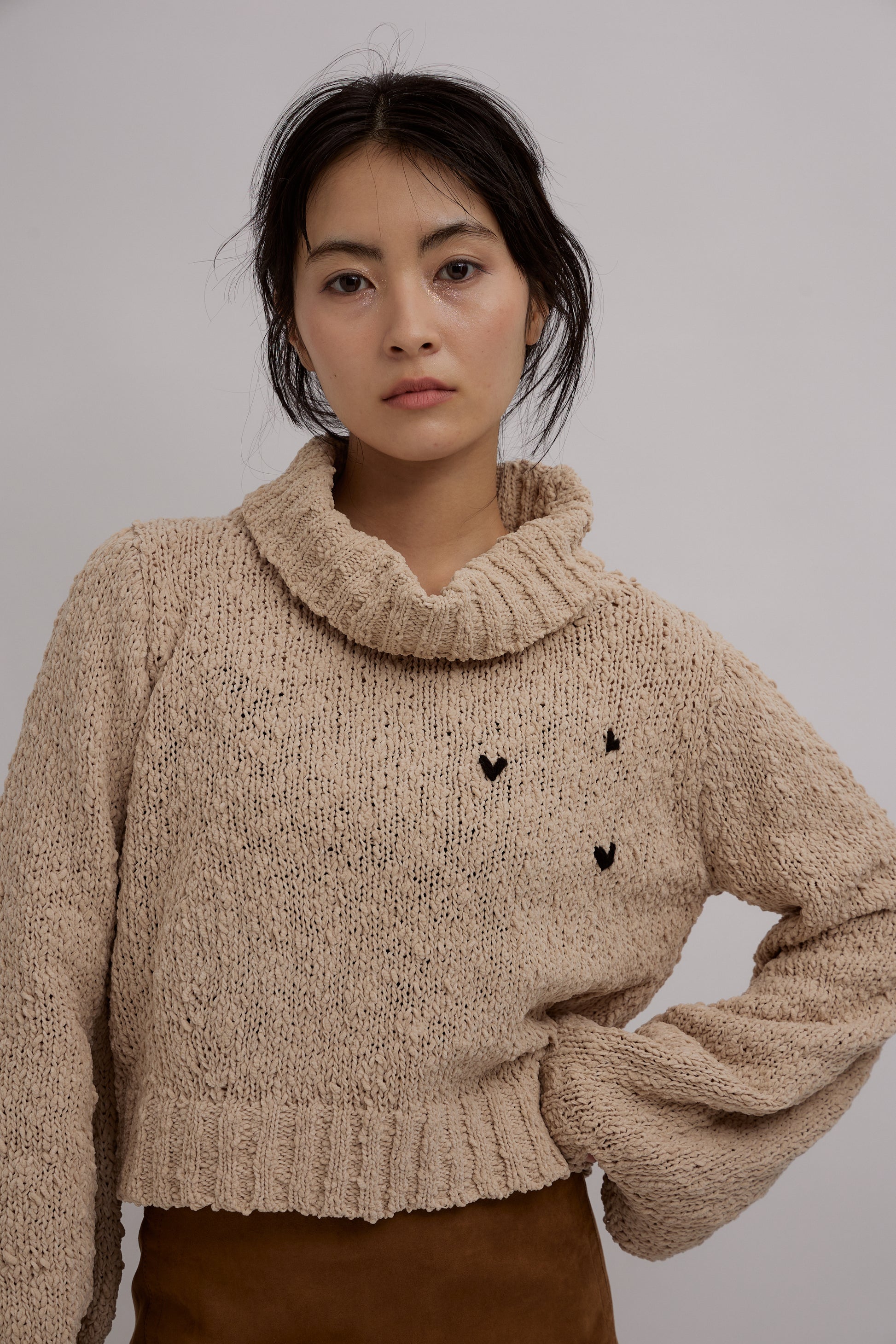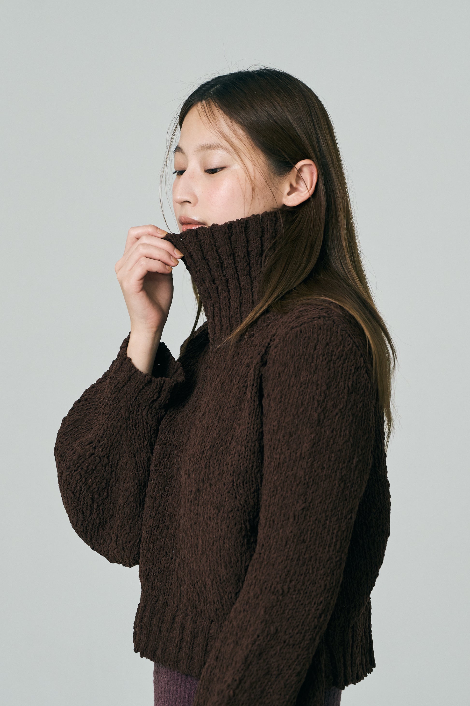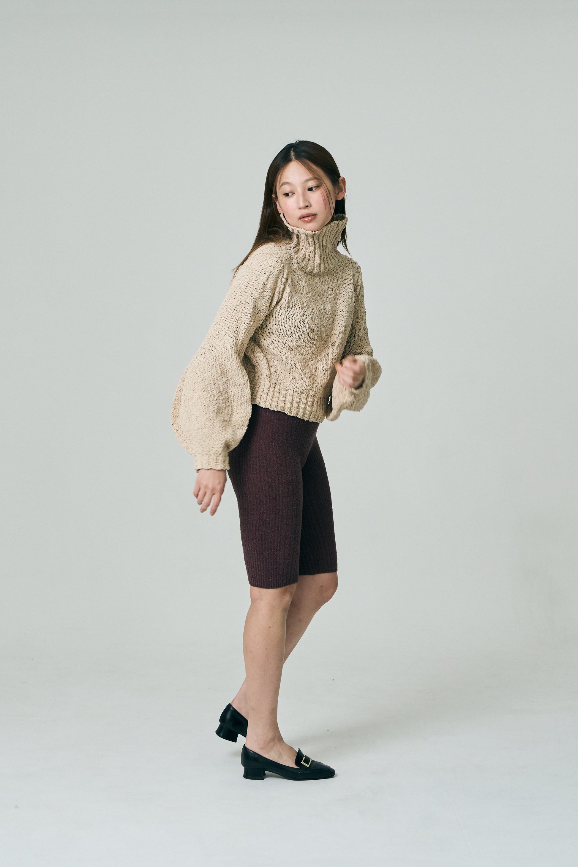 繭の楕円が繰り返されているようなポコポコした糸が特徴的なショート丈ニット。袖はゆったりとしたコクーン型であり、ショート丈に仕立てることで、着用にゆとりはありながらも着ぶくれせずすっきりとしたシルエットを実現。